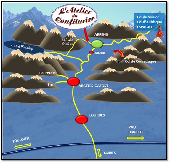 Depuis Argeles-Gazost, prendre la direction du Val d’Azun, traverser les villages d’ Arras, d’ Aucun, de Marsous, et à Arrens prendre la direction du Col des Bordères. Nous sommes à 1 km du centre du village. Passer le petit pont et continuer sur environ 300 mètres. L’Atelier est à gauche face à la centrale EDF. Vous êtes arrivés !
